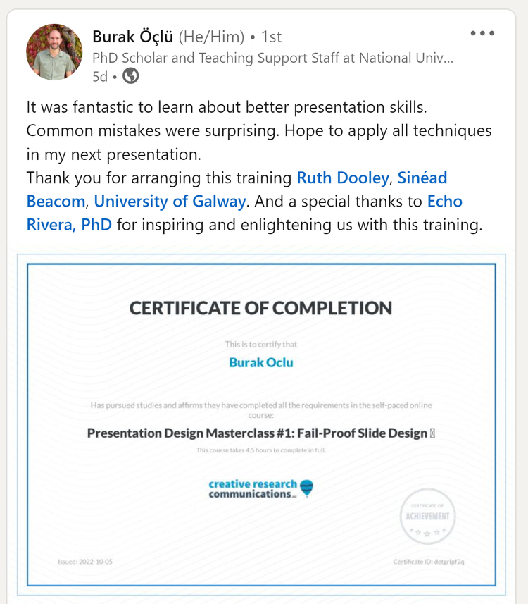 Once I did that, every time I gave a presentation someone (even supervisors and professors) would come up to tell me that it was the best presentation they’ve ever seen.